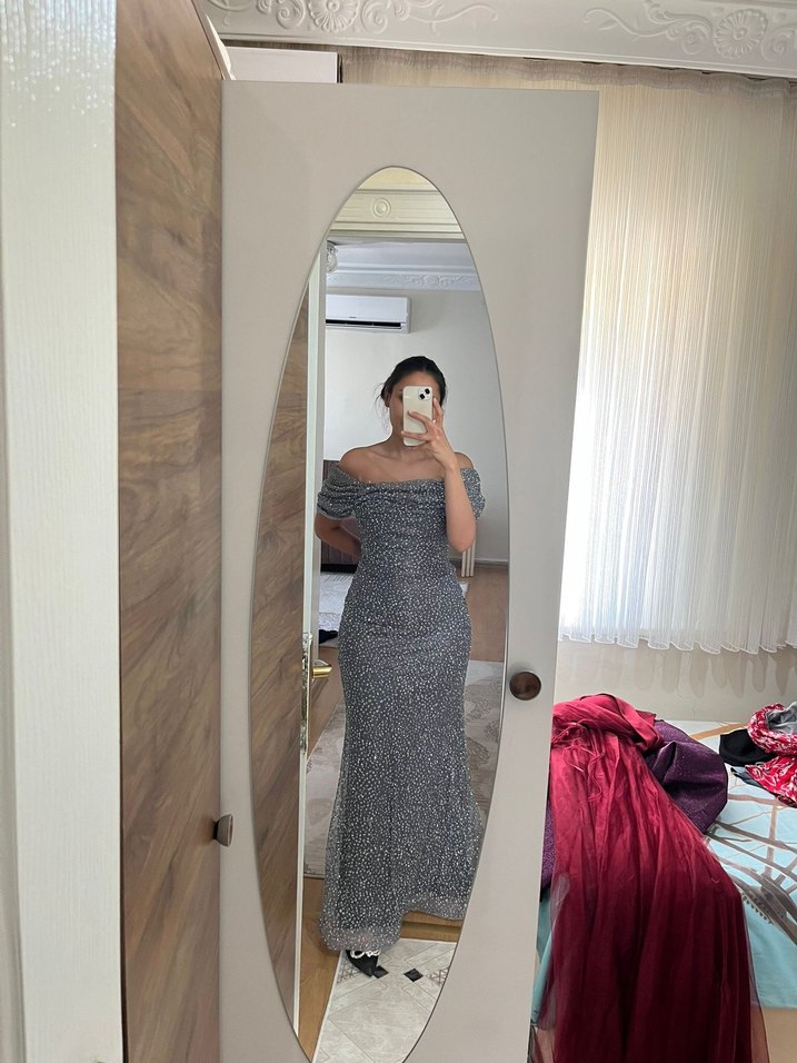 Gri Drapeli Uzun Kadın Abiye Elbise