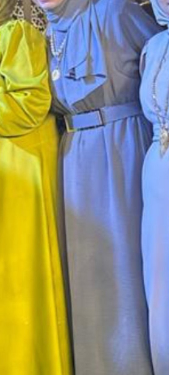 Gri renkte, ince ve uzun kesimli, drapeli ve satenimsi kumaştan kadın elbisesi. Modest ve klasik tarzda, düğün ve günlük kullanım için uygundur.