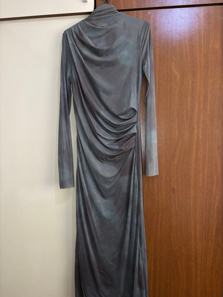 Yüksek yakalı, uzun kollu ve vücuda oturan bu uzun elbise, yumuşak sentetik kumaştan ve hafif batik desenlidir hiç giyilmedi
