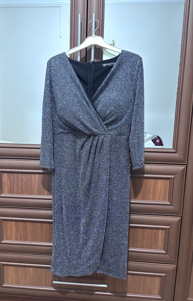 V yaka ve drapeli tasarıma sahip, uzun kollu ve fitted kesim gri kadın abiye elbise. Ofis için uygun, sade ve klasik şıklık sunar.