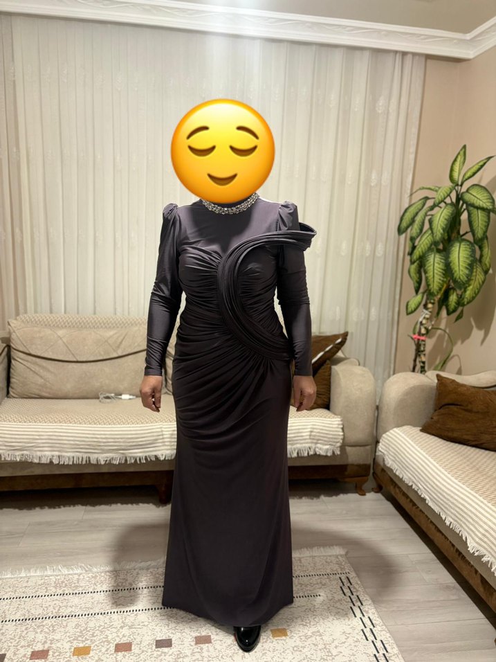 Bu oturmalı uzun abiye elbise, yüksek yakası ve uzun kolları ile gri renkte klasik gotik tarzda drapeli detaylar sunar, parti için uygundur. Elbisenin tüllüde içindedir