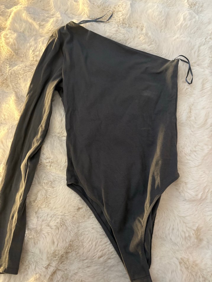 Yumuşak sentetik kumaştan yapılmış, yüksek yakalı ve uzun kollu gri drapeli, vücuda oturan bluz. Sokak modası ve athleisure tarzına uygun avant-garde detaylar içerir.