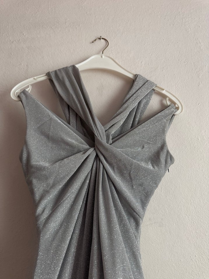 Drapeli tasarımı, kolsuz ve V yakasıyla fitted kesim uzun abiye elbisedir. Gri rengi ve minimalist stili çağdaş modaya uygundur. Parti için idealdir. ✨