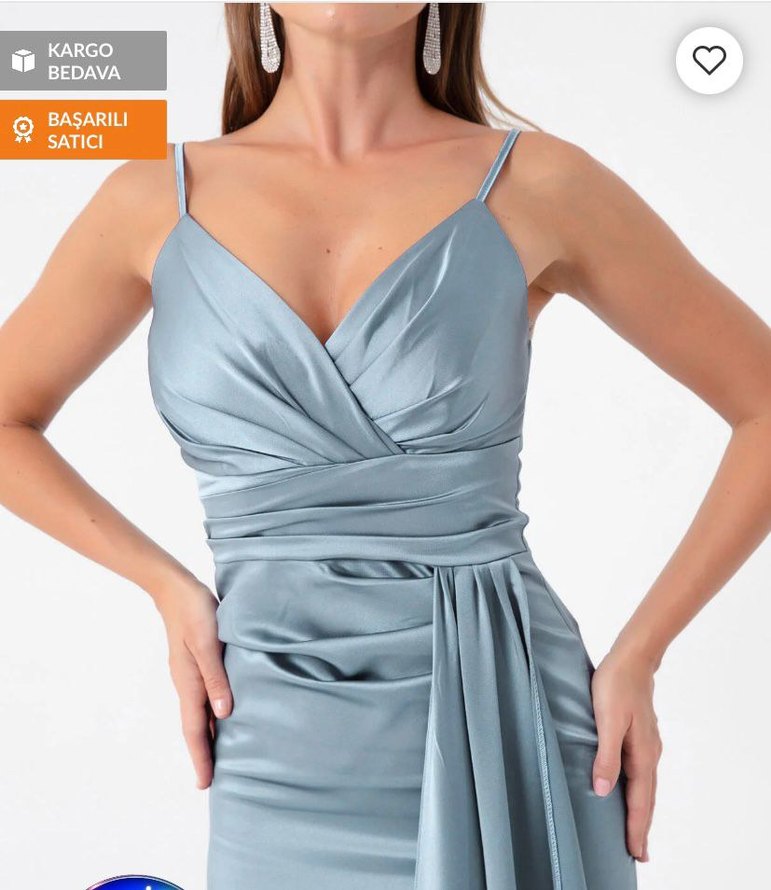 Bu şık gri abiye elbise, drapeli tasarımı ve ince askılı V yaka detaylarıyla parti için uygundur. Fitted kesim ve uzun boy özelliklidir. ✨