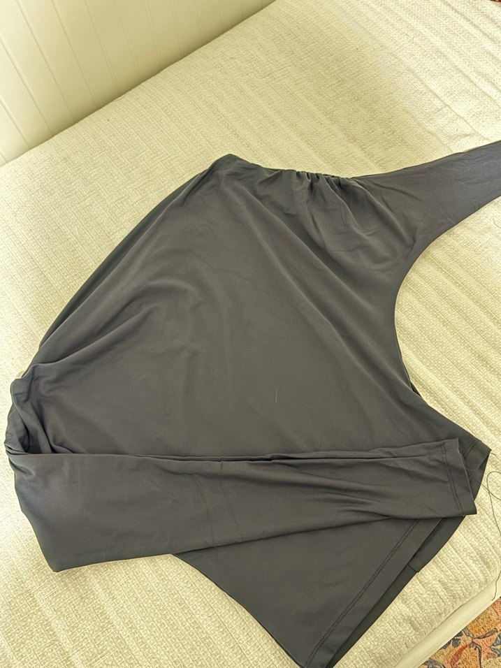 Gri Drapeli Yakası Bol Kesim Bluz tasarıma sahiptir. Yumuşak sentetik kumaştan üretilmiş olup, rahat ve çağdaş athleisure tarzındadır.