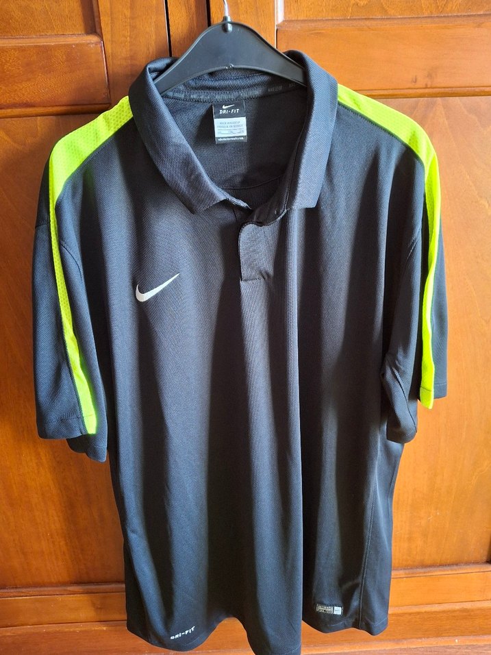 Gri renkli, neon yeşil şeritli kısa kollu erkek polo tişört. Düğmeli önü ve yakası, bol kesim, sentetik kumaştan, spor kullanıma uygun. Nike logosu göğüste. drifit terletmez kumas sifir hic giyilmedi orijinal