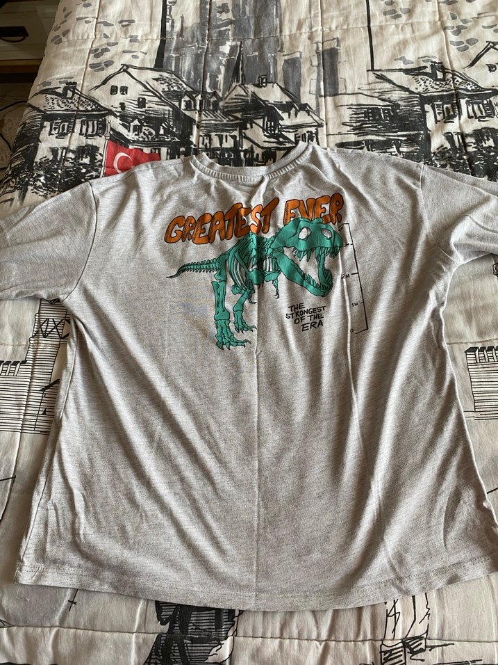 Gri renkte, düğmeli ve baskılı dinozor desenli, kısa kollu, bol kesim erkek tişörtü. Yuvarlak yaka, rahat sokak stili için uygun.