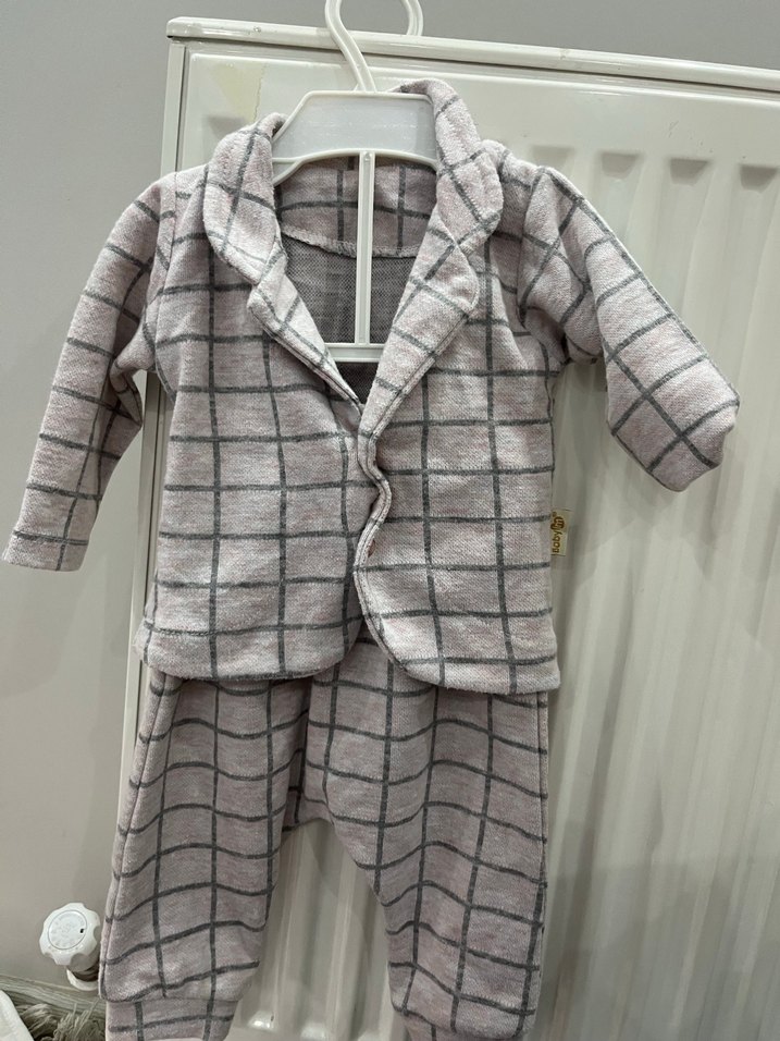 Gri renkli, uzun kollu, düğmeli ve yakalı üst ile uyumlu pantolondan oluşan bebek takımı. Yumuşak ve sıcak kumaştan, sade kareli desene sahip.