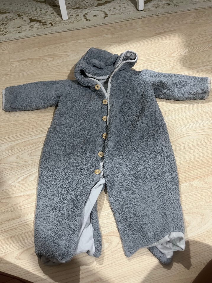 Gri renkli, düğmeli ve kapüşonlu bebek tulumu, yumuşak ve sıcak kumaştan yapılmıştır. ❄️
