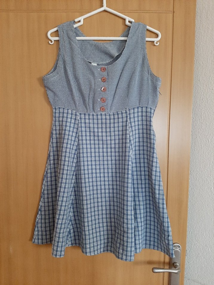 Pamuklu, kolsuz, belden kesik ve bisiklet yaka elbise. Düğmeli detaylı, ekose desenli, vintage ve bohem tarzda midi boy mavi elbise. boy 86 cm koldan kola 50 cm bel 80 cm yandan fermuarli 2 3 ancak giyilmistir tertemiz hiçbir kusur yoktur