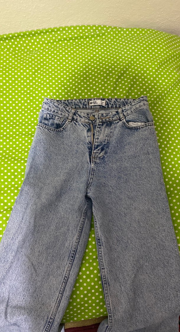 Gri denim kumaştan, düğmeli ve bol kesim kadın jean. Normal midi boyda, rahat sokak stili için uygun.