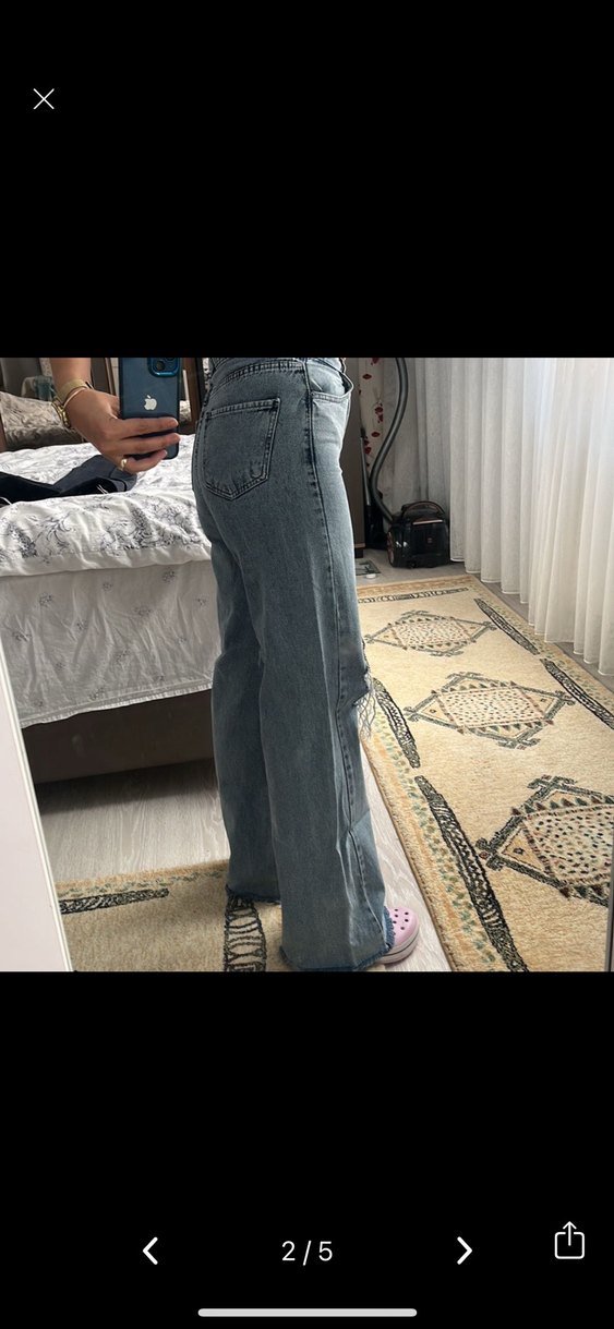 Gri renkte, düğmeli detaylara sahip bol kesim midi uzunlukta kot pantolon. Günlük kullanıma uygun rahat sokak stili pantolon.