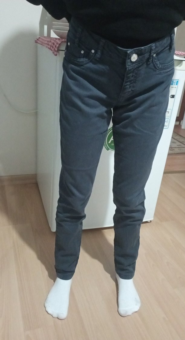 Gri renkli, düğmeli, normal boy, dar kesim çocuk kot pantolon, günlük kullanıma uygun rahat stil ile.