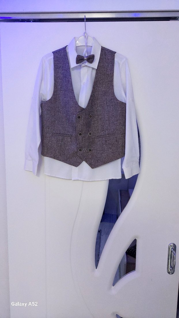 Gri, düğmeli, yakalı, kolsuz yelek, beyaz gömlek ve papyon ile tamamlanmış şık çocuk takımı. Tek bir kere 1 saatliğine giyildi gömlek 11 yaş yazıyor fakat 10 yaş ogluma uydu gömlek boyu 57 cm Sırt omuz 38 Gönül rahatlığıyla tercih edebilirsiniz.