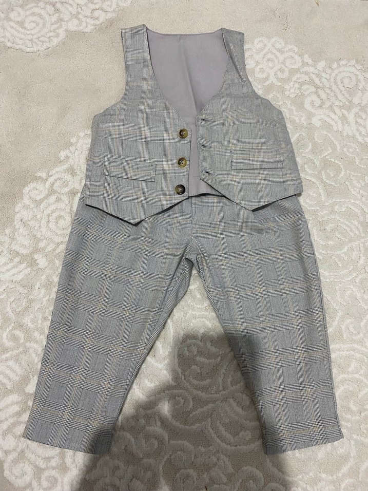 Gri düğmeli, yakalı ve kolsuz çocuk yelek ile uyumlu pantolonlardan oluşan takımdır. Regular fit ve sade desensizdir.