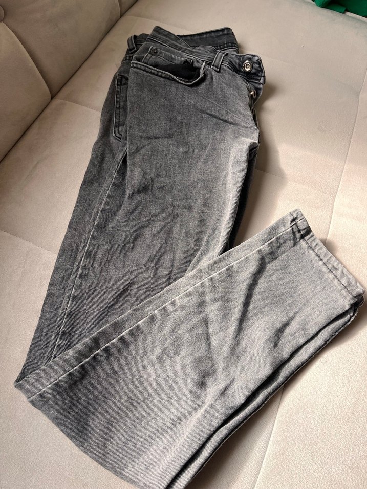 Gri renkli, düğmeli detaylı dar paça erkek jean, günlük kullanım ve sokak tarzı için uygundur.