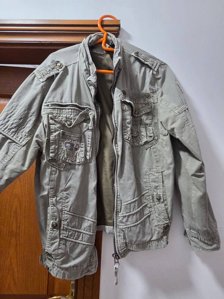 Gri renkte, düğmeli detaylara sahip, bol kesim ve uzun kollu denim erkek ceket. Notch yaka ve çoklu cepler bulunur, günlük kullanıma uygun.