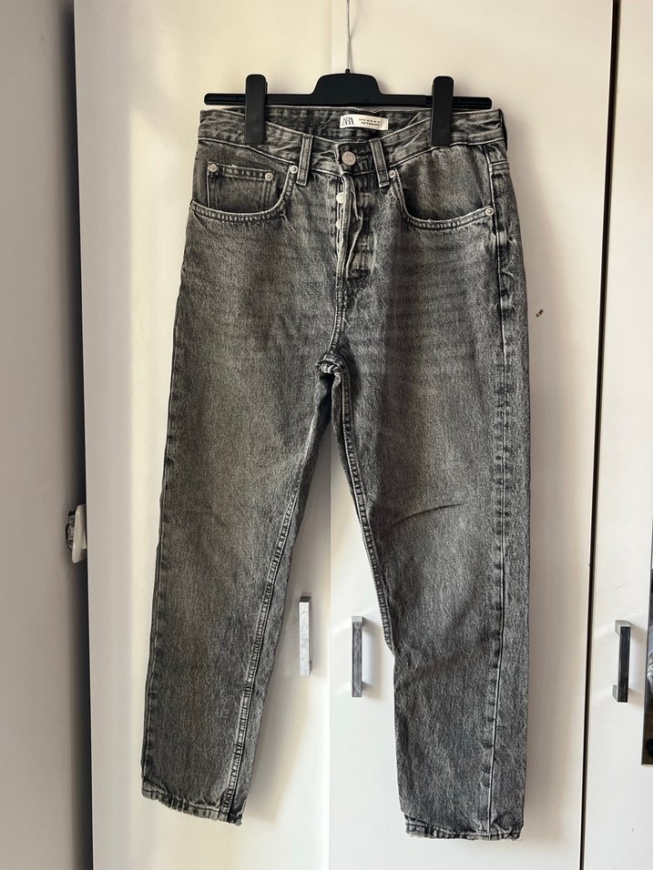Gri düğmeli denim kadın jean, normal boy ve rahat kesim. Günlük kullanım için uygun, sokak stiline uyumlu pantolon.