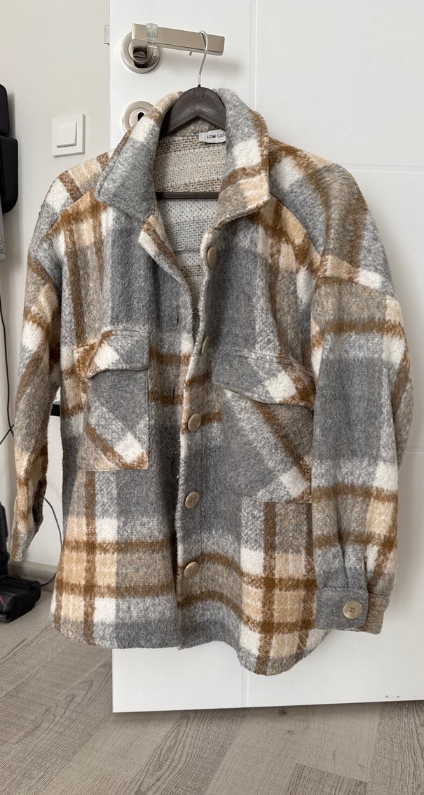 Gri yün kumaştan, ekose desenli, düğmeli ve notlu yakalı, uzun kollu, bol kesim midi uzunlukta kadın gömlek. Rahat sokak stili için uygundur.