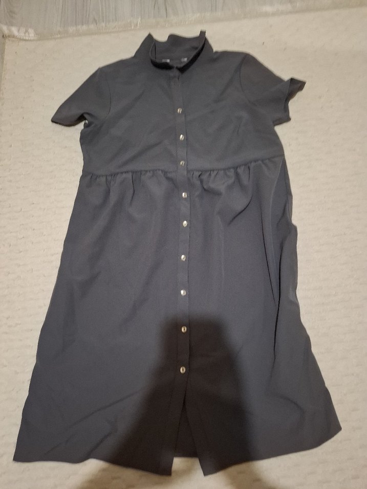 Gri, düğmeli, kısa kollu, yakalı hamile midi elbise, rahat bol kesimi ve sentetik kumaşıyla günlük kullanıma uygundur.
