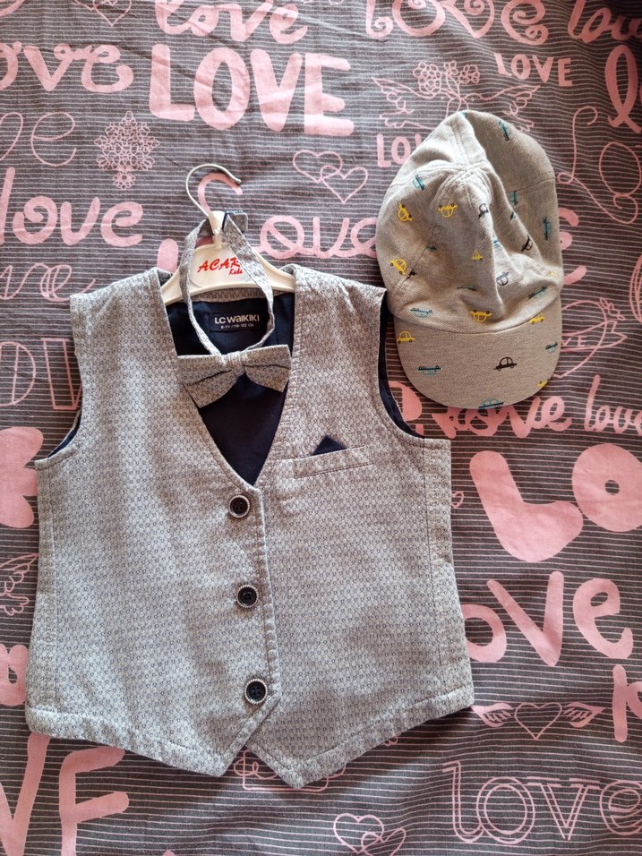 Gri düğmeli erkek çocuk yeleği, kesik yakalı ve yumuşak tekstil kumaştan. Baskılı şapka ile tamamlanır, sokak stili için uygundur.