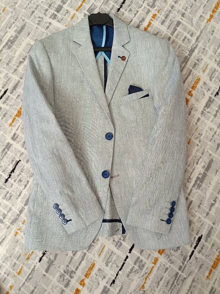 Gri renkli, düğmeli erkek çocuk blazer ceket, keskin yakalı ve uzun kolludur.desen içermeyen, günlük şık tarzda bir modeldir. 1 kez giyildi görüldüğü gibi tertemiz sorunsuz 11-12 yaşa uygun