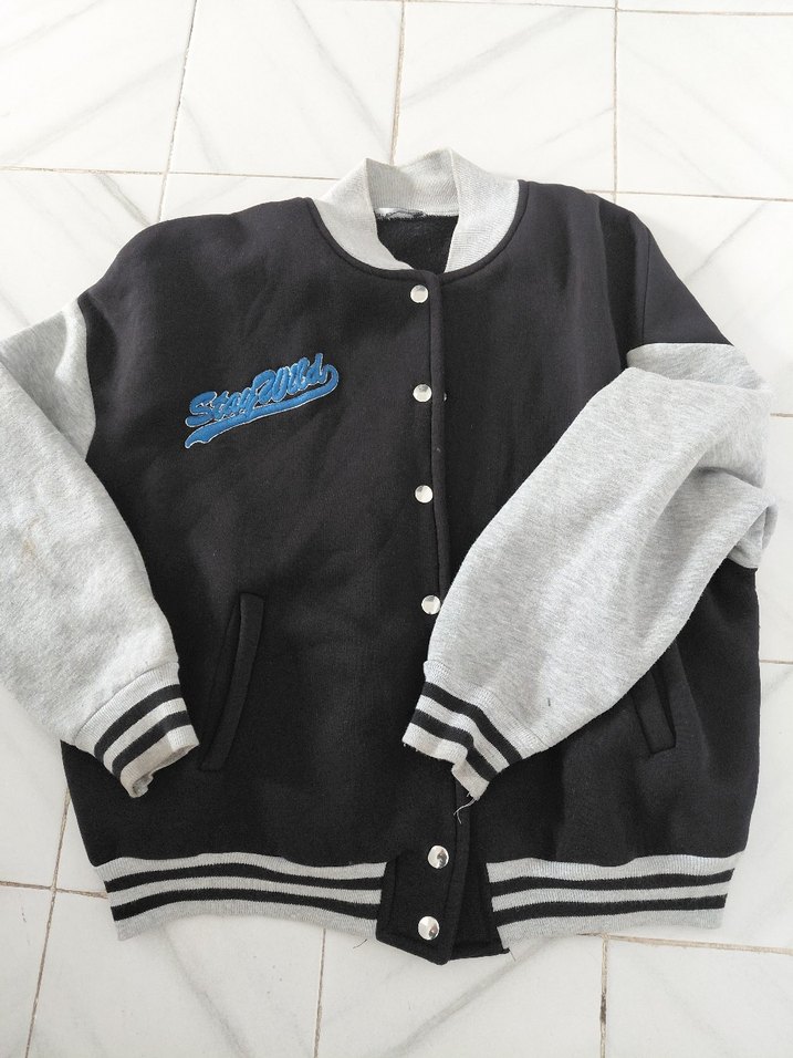 Düğmeli, bol kesim gri erkek çocuk ceketi. Yumuşak fleece kumaştan, bisiklet yaka ve sokak stiline uygun tasarım.
