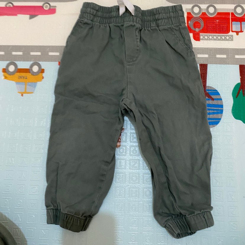 Gri renk, pamuklu, düğmeli ve lastikli paçalı erkek çocuk pantolonu, rahat kesim ve streetwear tarzında.