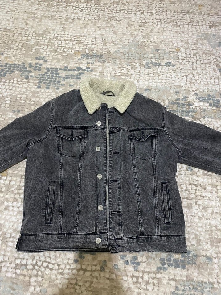 Gri renkli, düğmeli, yakalı ve uzun kollu bol kesim denim ceket. Midi boy uzunluğunda, günlük sokak stiline uygun.