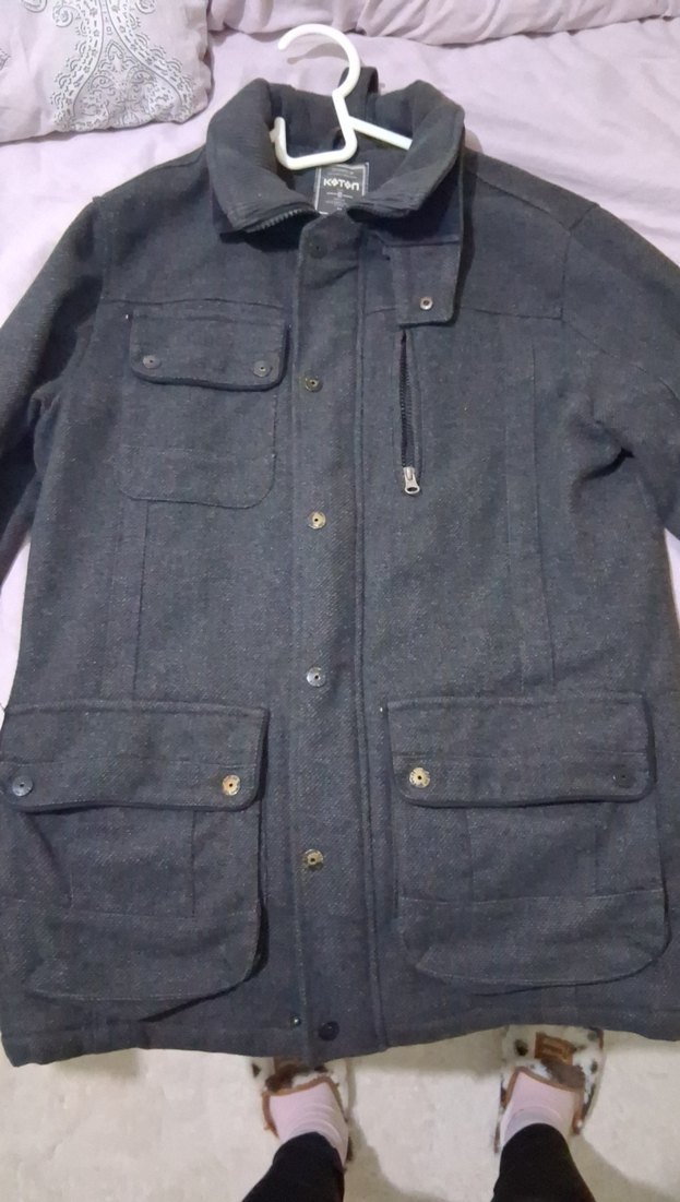 Gri renkte, düğmeli ve notched lapel yaka detaylı erkek denim kaşe. Regular fit ve uzun kolludur, günlük sokak stiline uygundur.