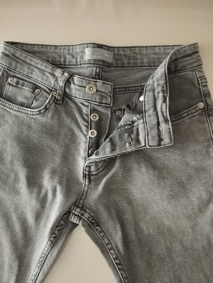 Gri renk düğmeli erkek denim pantolon, normal boy ve regular fit kesimle günlük rahat sokak stili için uygundur. Desensiz midi uzunluktadır.