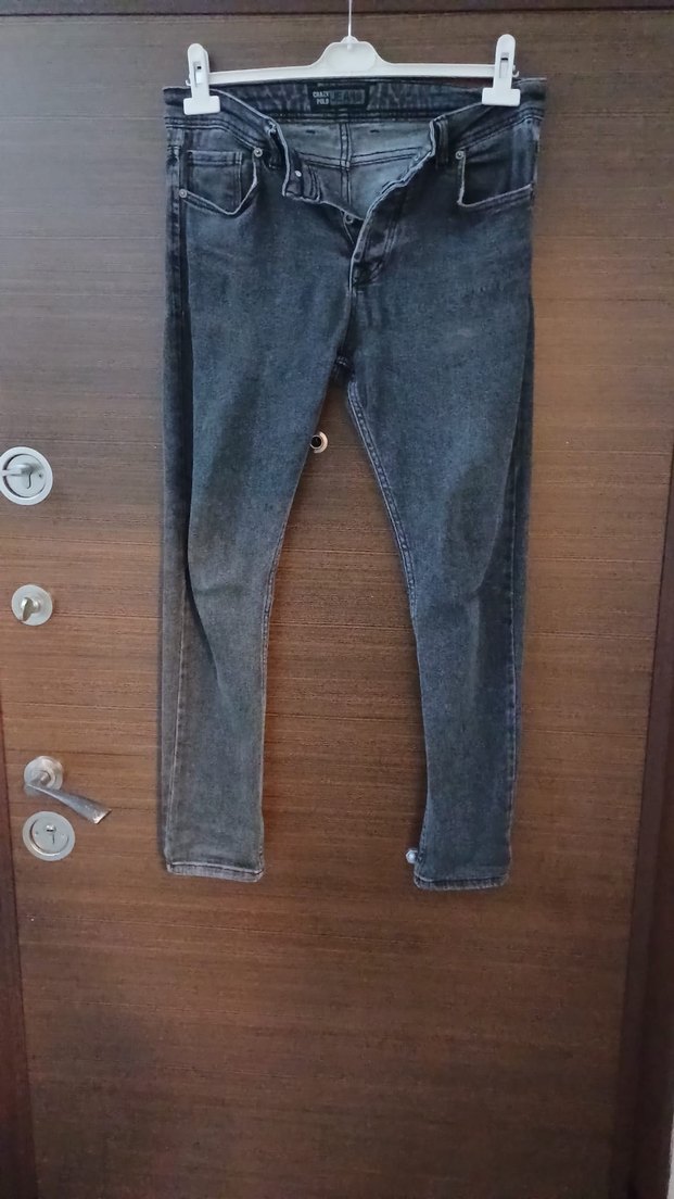 Gri renkte, düğmeli ve normal boyda erkek denim pantolon. Rahat kesimi ve günlük kullanıma uygun sokak stiliyle dikkat çeker. içten cebi yırtık