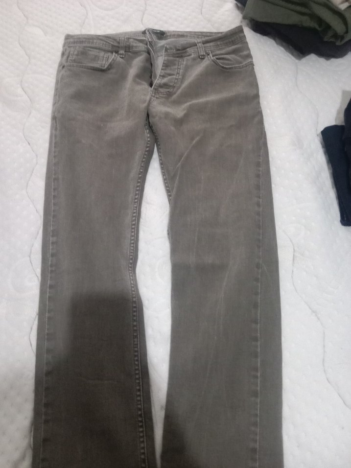Gri renkli erkek denim pantolon, düğmeli ve regular fit kesimlidir. Günlük kullanım için uygun, sokak tarzını yansıtır.