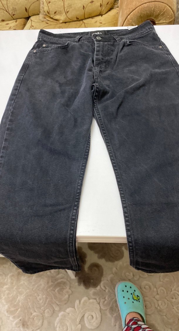 Siyah i renkli, düğmeli, bol kesim erkek denim pantolon. Midi boyda ve desensiz, günlük rahat kullanıma uygun. Bel39 basen 54 boy 92 cm