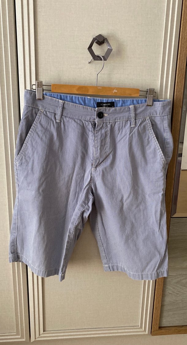Düğmeli, gri renkli, midi boy, gevşek kesim denim şort. Hafif çizgili deseniyle günlük sokak stiline uygun.