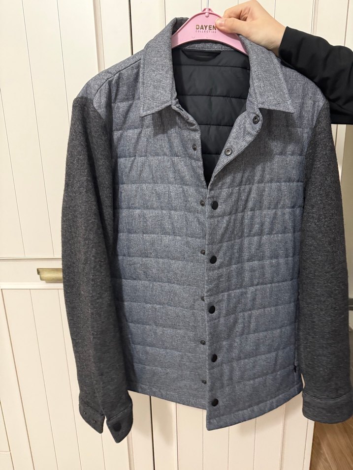 Düğmeli ön, kesik yaka ve uzun kollu erkek günlük ceket. Sentetik kumaştan, gri renkte ve düz desende, normal kesim ve günlük sokak stili için uygundur.