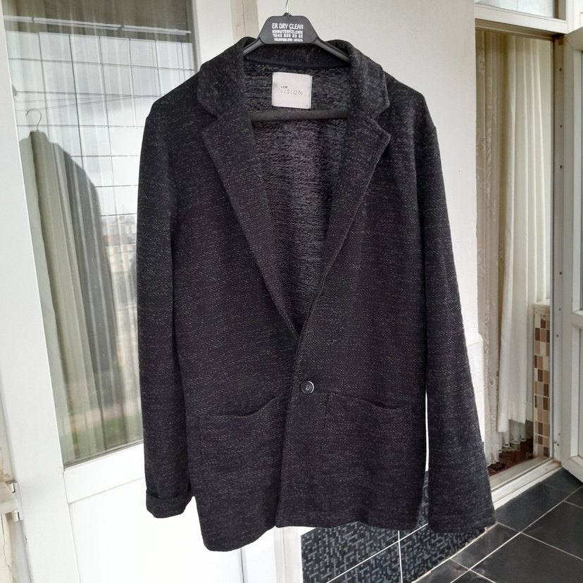 Gri renkli, düğmeli ve keten kumaştan yapılmış erkek ceket. Normal kesim, uzun kollu ve midi boyda, ofis kullanımı için uygundur.