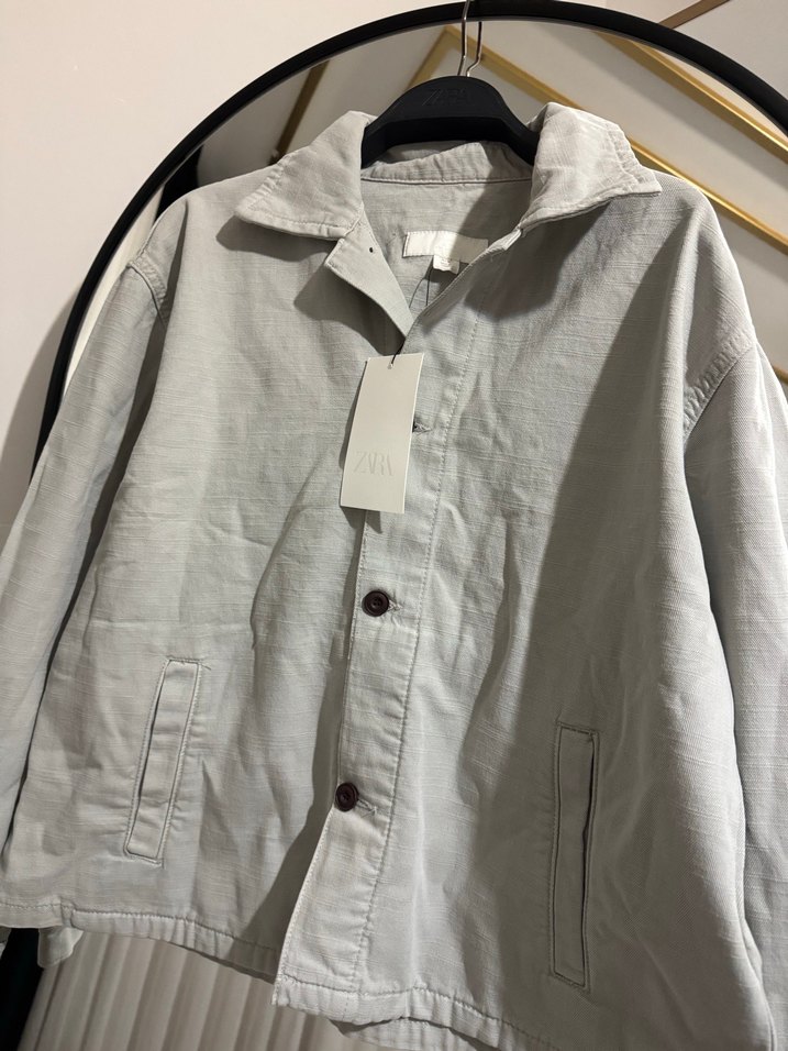 Erkekler için düğmeli, keten kumaştan yapılmış gri ceket. Notch yaka, uzun kollu ve rahat kesimlidir. Günlük sokak stili için uygundur.