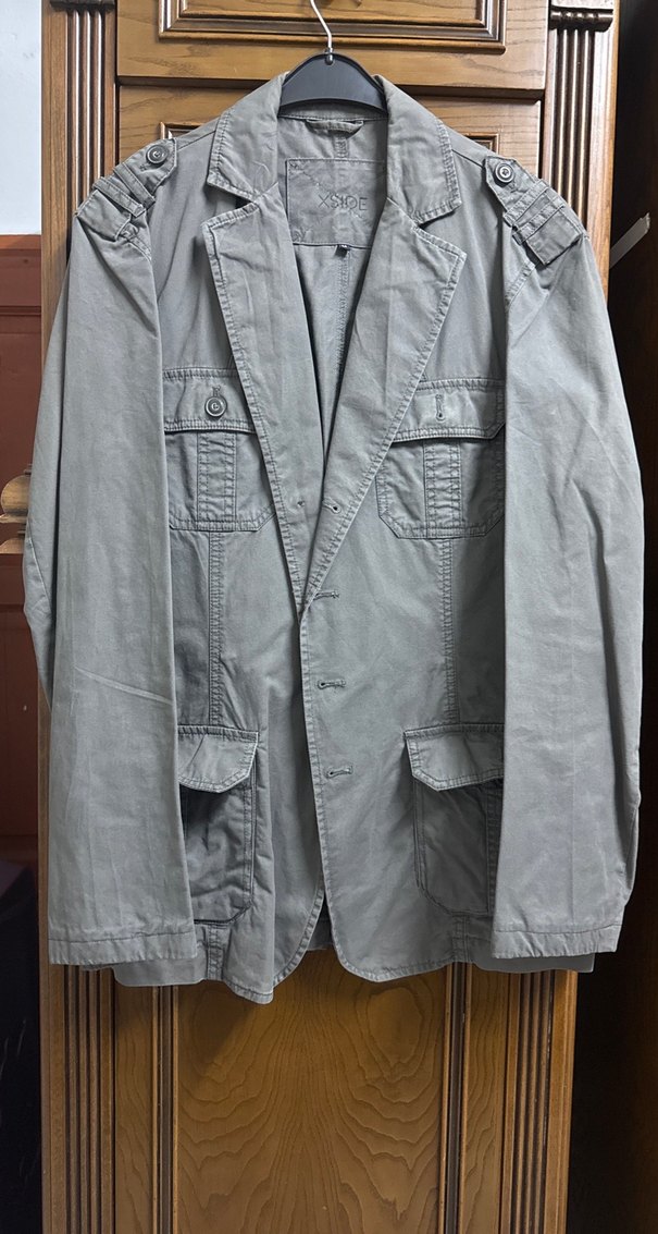 Düğmeli ön kısmı ve kesik yaka detayıyla erkek keten ceket. Gri, uzun kollu, normal midi boyda ve rahat kesimlidir. Günlük sokak stili için uygundur.
