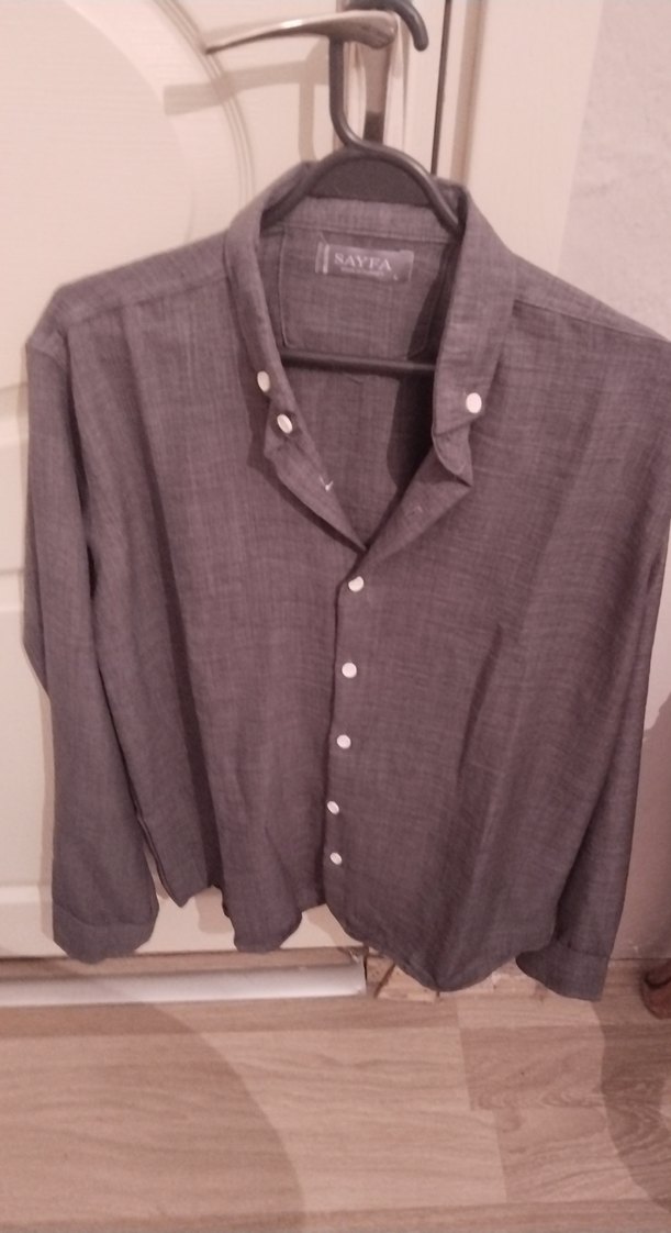 Gri renkli, keten kumaştan yapılmış erkek gömleği, düğmeli ve uzun kolludur. Normal kesim ve notched lapel yaka ile günlük rahat sokak stili için uygundur.