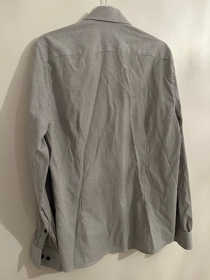 Bu erkek gömlek, düğmeli ve çentikli yaka detayına sahip, uzun kollu keten kumaştan üretilmiştir. Gri renkte ve ofis kullanımı için uygundur.