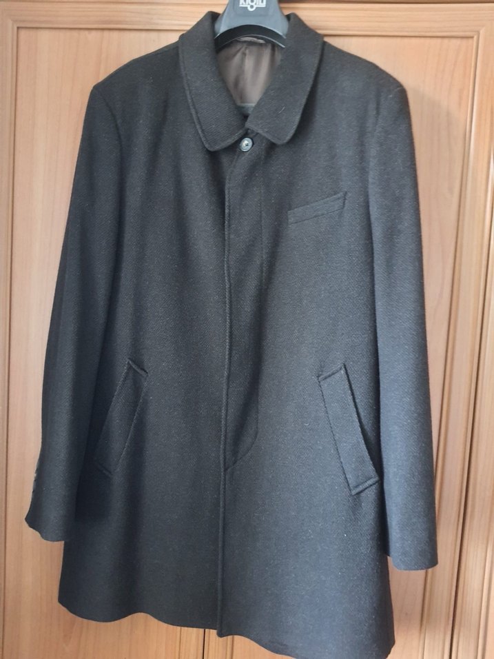Gri renkli erkek palto, klasik düğmeli ön ve normal kesim ile uzun kolludur. Yumuşak ve sıcak kumaştan üretilmiş, midi boy ve desensiz tasarıma sahiptir.