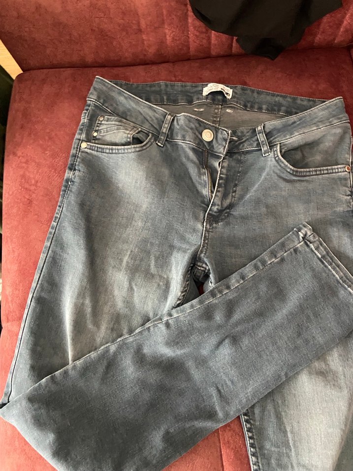 Gri renk, düğmeli, normal boy ve fitted kesim erkek kot pantolon. Günlük kullanıma uygun, rahat ve trend görünümlü.
