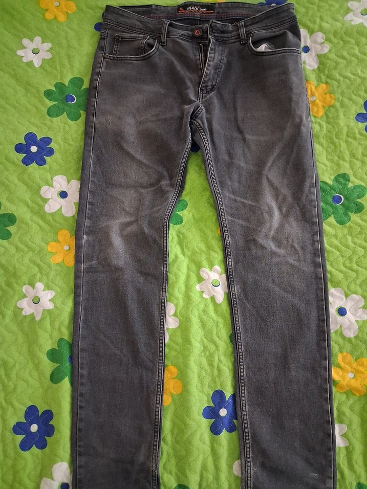 Gri renk, düğmeli, bol kesim erkek denim pantolon. Normal boyda, günlük kullanıma uygun rahat bir tarza sahip.(Ürünün üzerinde bazı lekeler var yıkanınca geçer mi bilmiyorum)