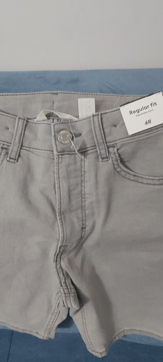 Düğmeli, gri denim erkek pantolonu. H&M markasına ait, baskılı detaylı ve regular fit kesimle trendy casual tarzda. sıfır etiketli ürün