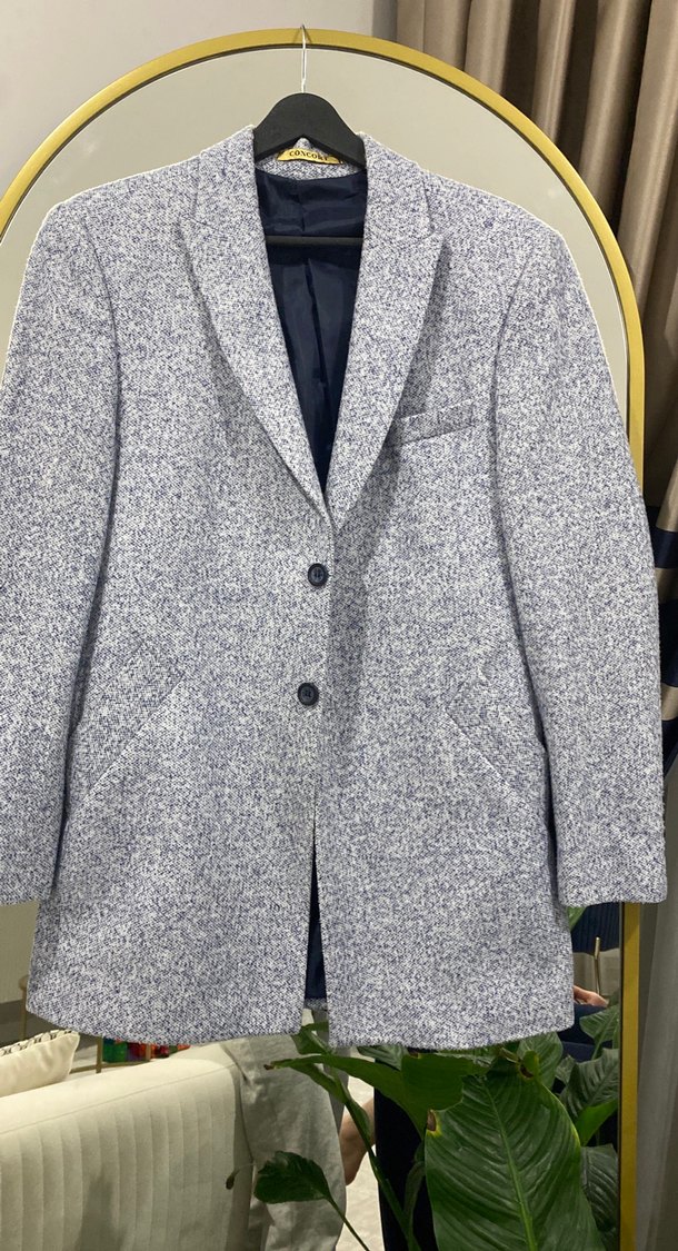 Gri renkli, düğmeli erkek ceket. Düz desensiz, normal boy ve uzun kolludur. Ofis ve günlük kullanıma uygundur.