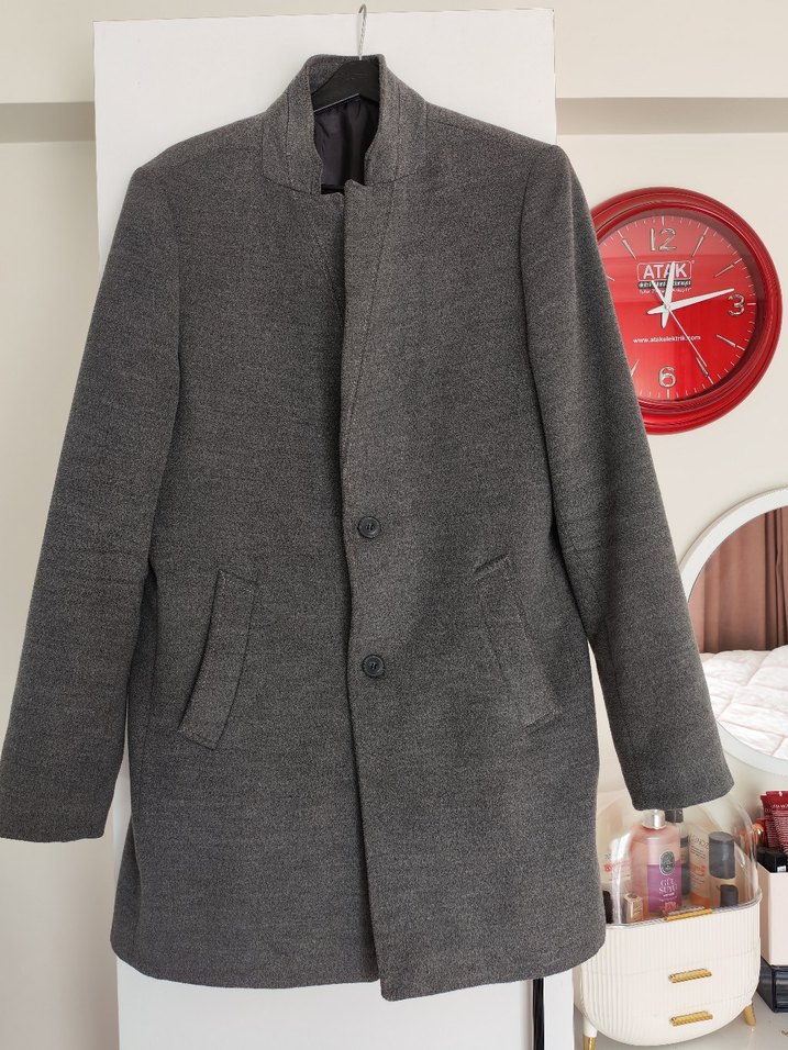 Gri renkte, düğmeli, cepli ve uzun kollu erkek kaban. Yün kumaştan yapılmış, normal kesim ve midi boyda, günlük ve iş stiline uygun.