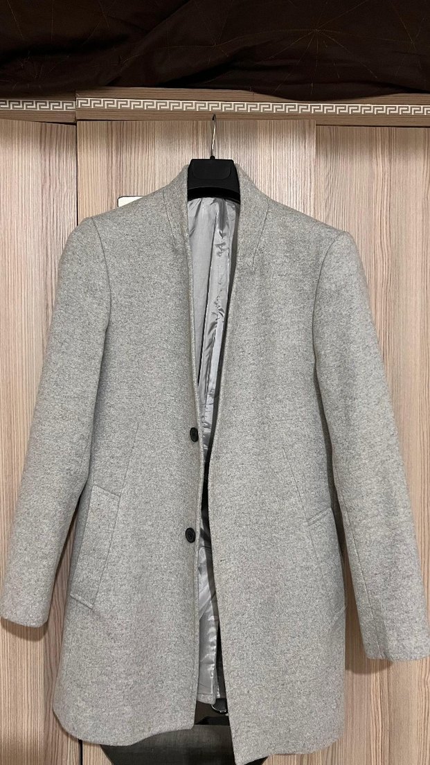 Gri renkli, düğmeli erkek kaban, notched yaka ve uzun kolludur. Sentetik kumaştan üretilmiş, normal kesim ve midi boydadır. İş ortamına uygundur.