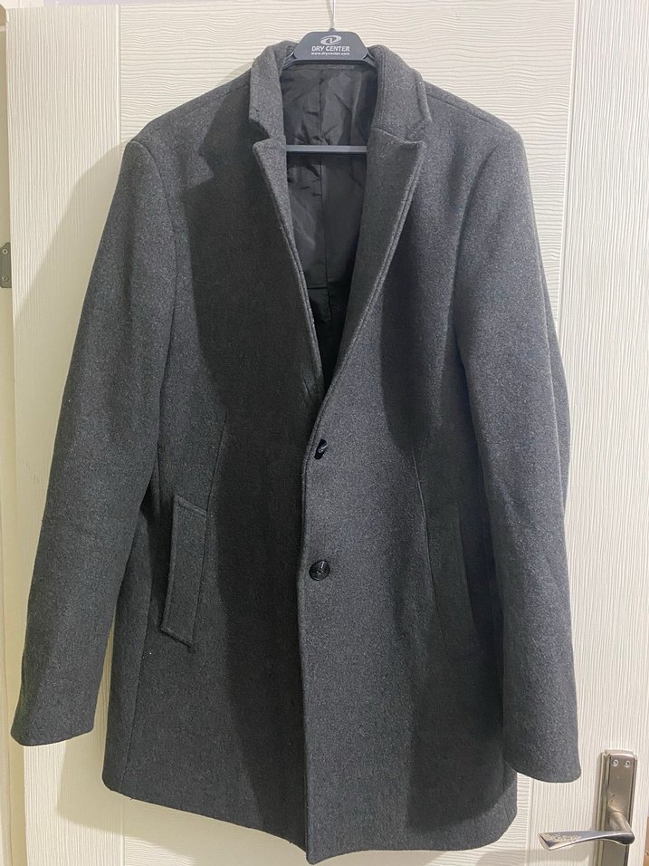 Gri renk, düğmeli, regular fit midi uzunlukta erkek kaban. Notched lapel yakalı, uzun kollu ve sentetik kumaştan üretilmiştir.
