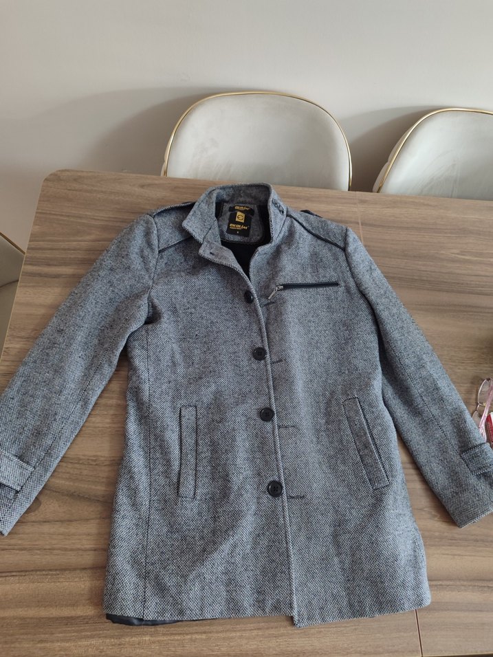Gri renkli, düğmeli, notched lapel yakalı erkek midi kaban. Yumuşak ve sıcak kumaştan, uzun kollu ve rahat kesim. Günlük ve sokak stiline uygun.